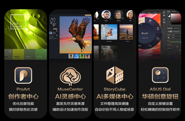 其中,小硕知道支持智慧问答、文档总结、个人知识库、AI绘图、AI识图等功能,不论是寻找灵感、快速总结资料、生成插图,它都能助你高效解决,基于端云一体大模型设计,即使在无网络的情况下也能持续为你提供帮助。StoryCube AI多媒体中心可助力创作者快速处理多媒体素材,实现素材的智能分类、剪辑与合成;ProArt创作者中心则提供一站式创作管理,方便创作者对软件设置、硬件性能进行个性化调整,优化创作流程;此次新增的MuseCenter为创作者提供丰富的创意资源与灵感库,帮助突破创作瓶颈。而华硕创意旋钮更是一个人无我有的亮眼功能,它能够自定义快捷键,一键调用常用工具或功能,比如在PS中快速调整画笔大小、图层透明度,在Pr中控制视频播放速度、音量等,大幅提升操作效率。