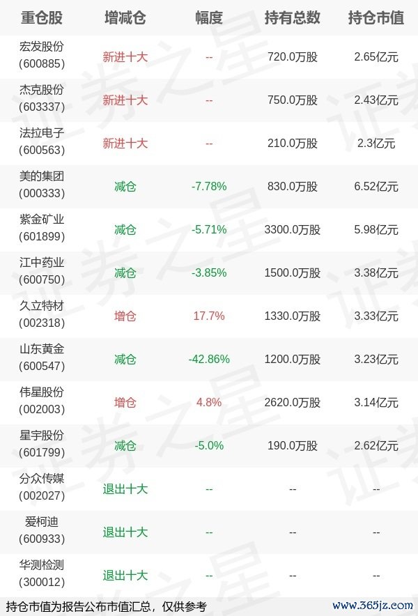 本站消息熊猫配资,4月21日广发基金旗下傅友兴管理的广发稳健增长开放式基金公布一季报,近1年净值增长率-0.6%。与上一季度相比,该基金前十大重仓股新增宏发股份,杰克股份,法拉电子;其中美的集团持仓占比5.75%,为该基金第一大重仓股;分众传媒,爱柯迪,华测检测等退出前十大重仓股;详细数据如下: