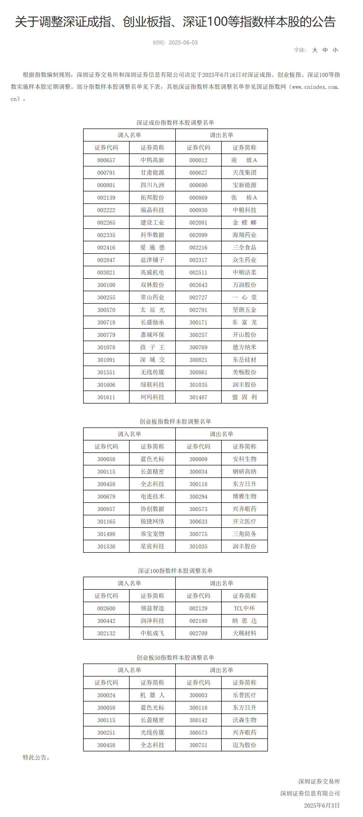 深交所调整深证成指、创业板指、深证100等指数样本股深交所调整深证成指、创业板指、深证100等指数样本股