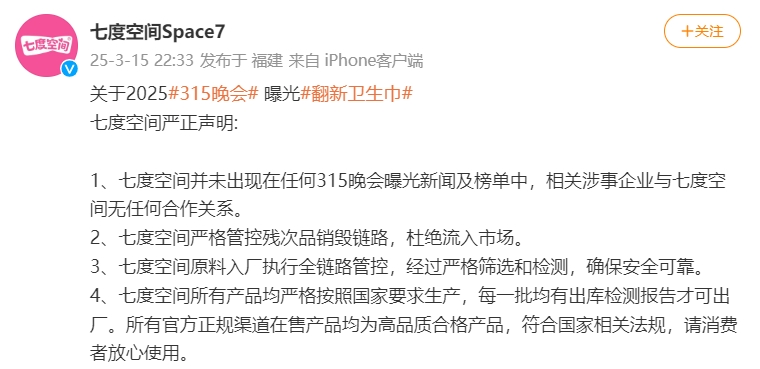 3·15晚会曝光翻新卫生巾,七度空间:与涉事企业无合作忠琦配资,严格管控残次品销毁链路3·15晚会曝光翻新卫生巾,七度空间:与涉事企业无合作,严格管控残次品销毁链路