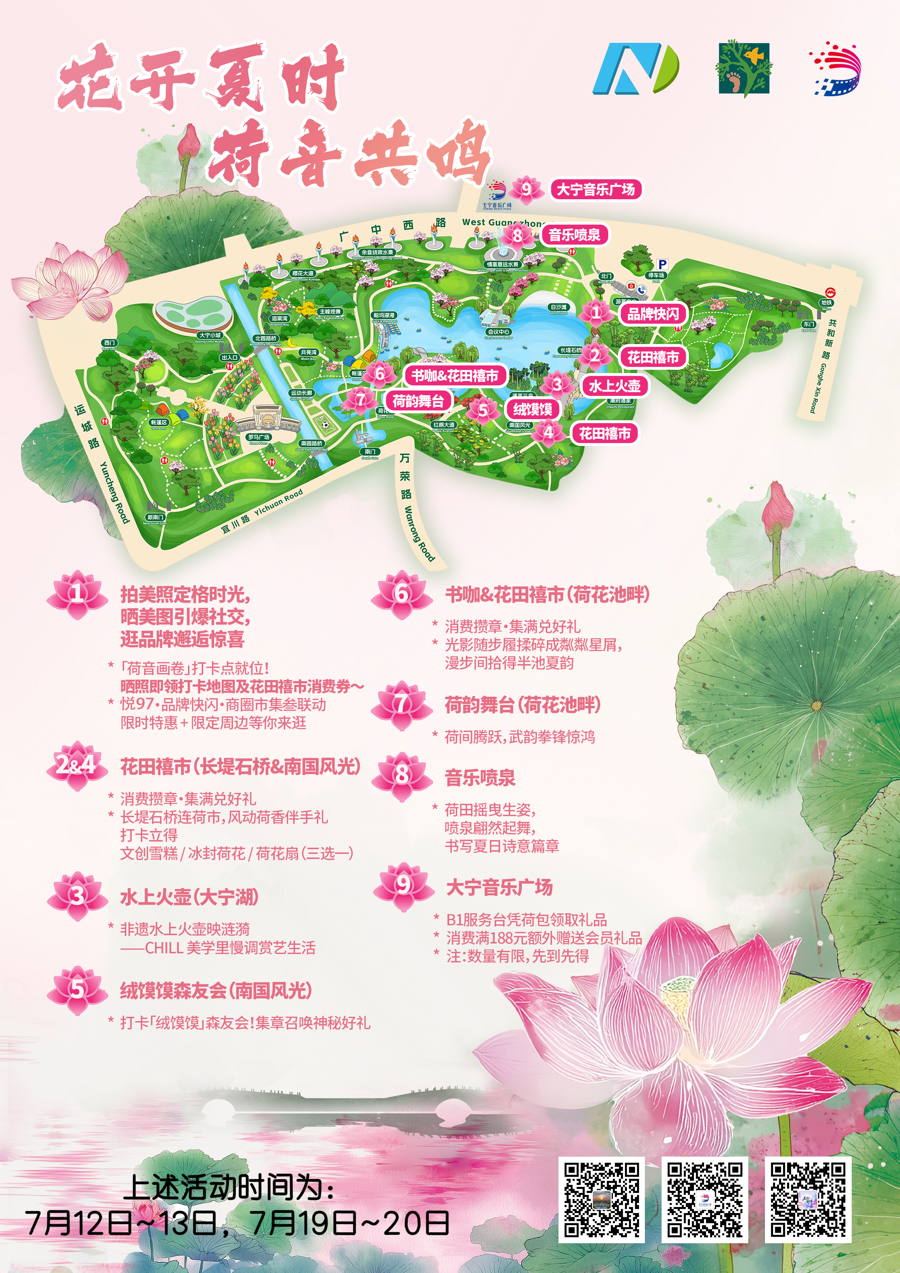 本次活动延续了往年夏日游园会深受好评、清新风雅的“荷”文化主题,聚焦于乘凉遛娃、吃喝逛玩、夜享繁华等需求旺盛的周末傍晚夜间时段。活动场地涵盖了音乐喷泉水景、公园北门广场、长堤石桥、南国风光及荷花池等南北线景观区域,还有富含“文艺范、小清新、精致风”等特色元素的文创美食综合市集蜿蜒其间,将抚慰人心的烟火气息、疗愈心灵的“悦己消费”有机串联,巧妙布局于公园广阔的自然生态空间中,为市民游客们造势一场“生态惬意、商业繁荣、文化多彩”的夏日盛事。