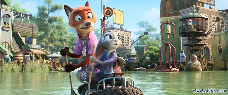 在视觉呈现上,动物城的版图得到拓展。从极寒之地到热浪滚滚的沙漠,从悬崖峭壁的山林到两栖动物生活的湿地市场,每个区域的刻画都较为细腻丰富。作为爬行动物的隐秘聚集地,湿地市场拥有独特的生态景观,浓郁的生活气息构筑了一个令人信服的世界。此外,街道上的汽车追逐、穿越数英里水管的旅程、树篱迷宫中的穿行,为动画电影的动作场景带来新意。