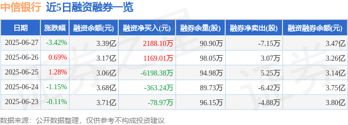 本站消息,截至2025年6月27日收盘,中信银行(601998)报收于8.46元,下跌3.42%,换手率0.23%优配配件助手,成交量93.29万手,成交额8.0亿元。