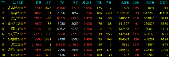 2025年7月3日,早盘开盘,国内期货主力合约多数上涨。多晶硅涨超4%,玻璃涨超3%,焦煤、SC原油、氧化铝涨超2%,铁矿石、焦炭、棕榈油、菜油、螺纹钢、纯碱涨超1%。跌幅方面,20号胶(NR)、玉米、PTA小幅下跌。