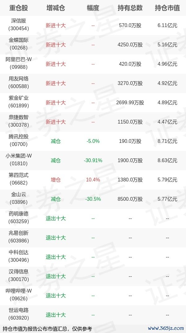 本站消息,4月21日招商基金旗下翟相栋管理的招商优势企业混合型基金公布一季报,近1年净值增长率44.61%。与上一季度相比,该基金前十大重仓股新增深信服,金蝶国际,阿里巴巴-W,用友网络,紫金矿业,鼎捷数智;其中腾讯控股持仓占比8.59%,为该基金第一大重仓股;药明康德,兆易创新,中科创达,汉得信息金御优配,哔哩哔哩-W,世运电路等退出前十大重仓股;详细数据如下: