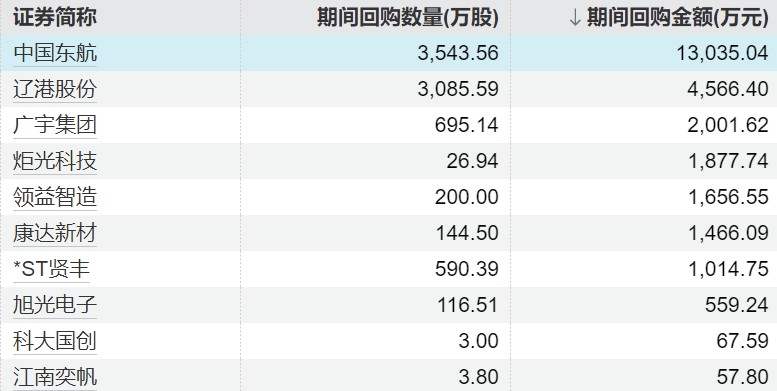 10家上市公司股票获回购,中国东航回购金额最高10家上市公司股票获回购,中国东航回购金额最高
