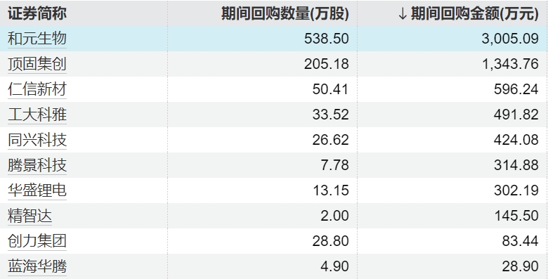 10家上市公司股票获回购,和元生物回购金额最高10家上市公司股票获回购,和元生物回购金额最高