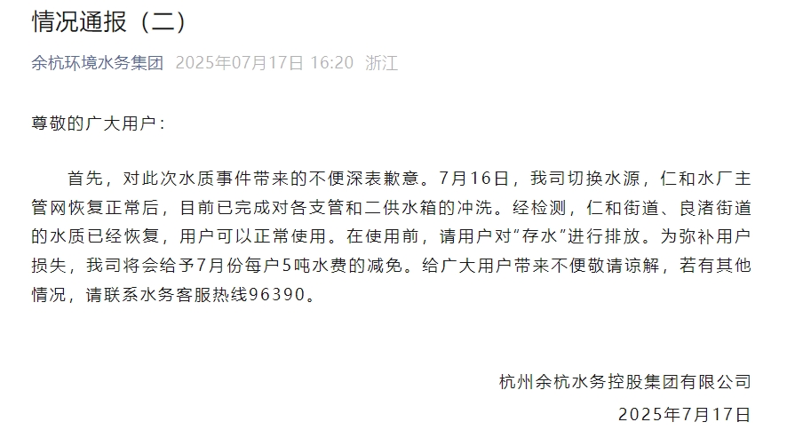 杭州余杭环境水务集团致歉:水质已恢复,请用户对“存水”进行排放杭州余杭环境水务集团致歉:水质已恢复,请用户对“存水”进行排放